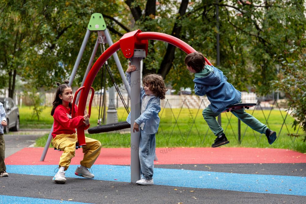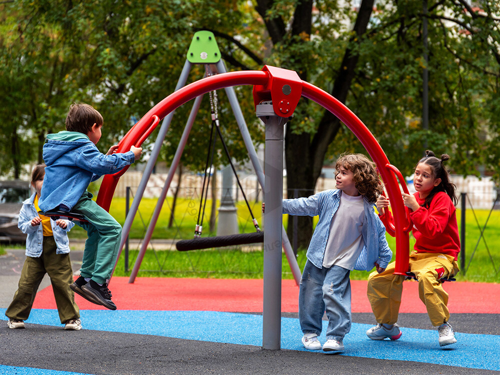 Двухместная карусель-качалка для детей. Конструкция состоит из металлического дугообразного коромысла с сидениями по краям и центральной стальной стойки. Вращение вокруг своей оси происходит за счет подшипников, установленных в основной стойке. Такой превосходный тренажер вестибулярного аппарата, опорно-двигательной и мышечной системы подарит массу положительных эмоций. Металл и пластик, используемые при изготовлении, способны устоять при любых погодных условиях.