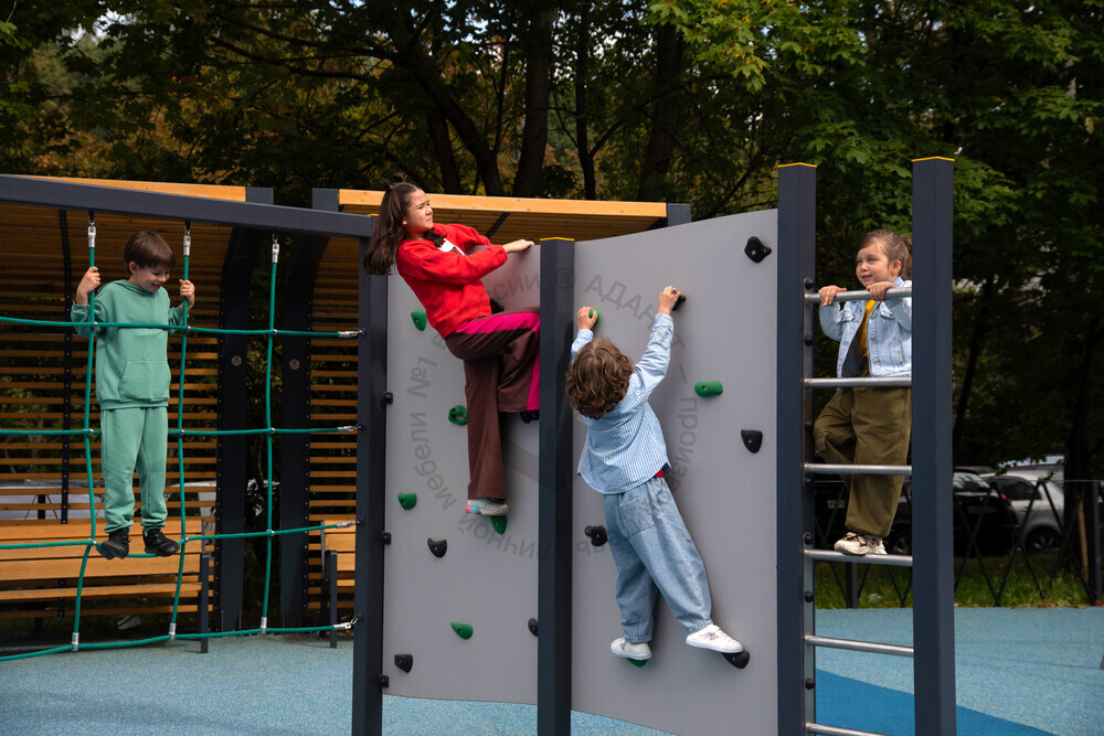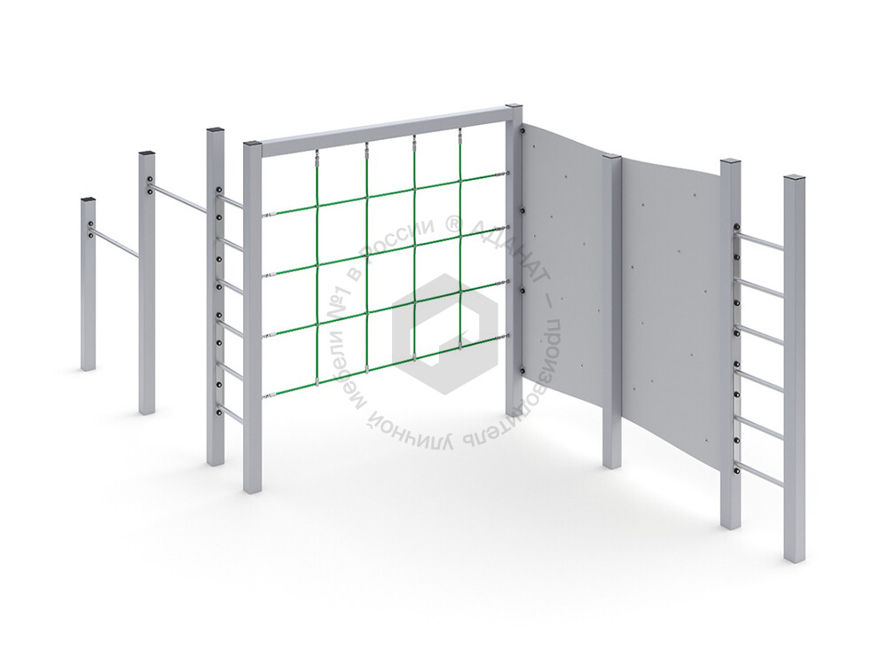 Функциональный детский комплекс для занятий спортом на улице. Уличная площадка состоит из множества спортивных элементов. Два турника для подтягиваний, с их помощью можно выполнять эффективные упражнения для развития мышц всей верхней части тела, для укрепления позвоночника и даже увеличения роста. Две шведских стенки для укрепления рук, ног, брюшного пресса. Канатная сетка для лазания - тренирует ловкость и координацию. Изюминка спортивной площадки - скалодром. Скалолазание развивает логическое и пространственное мышление, мелкую моторику.