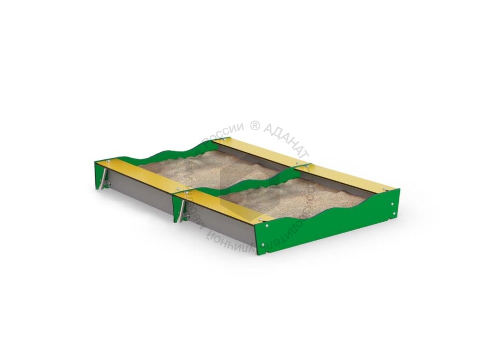 Яркая компактная песочница со сплошными сидениями и ограждениями в виде волны, одна из которых разделяет песочницу на две половины. Такая конструкция позволит малышам проявить фантазию в совместных играх.