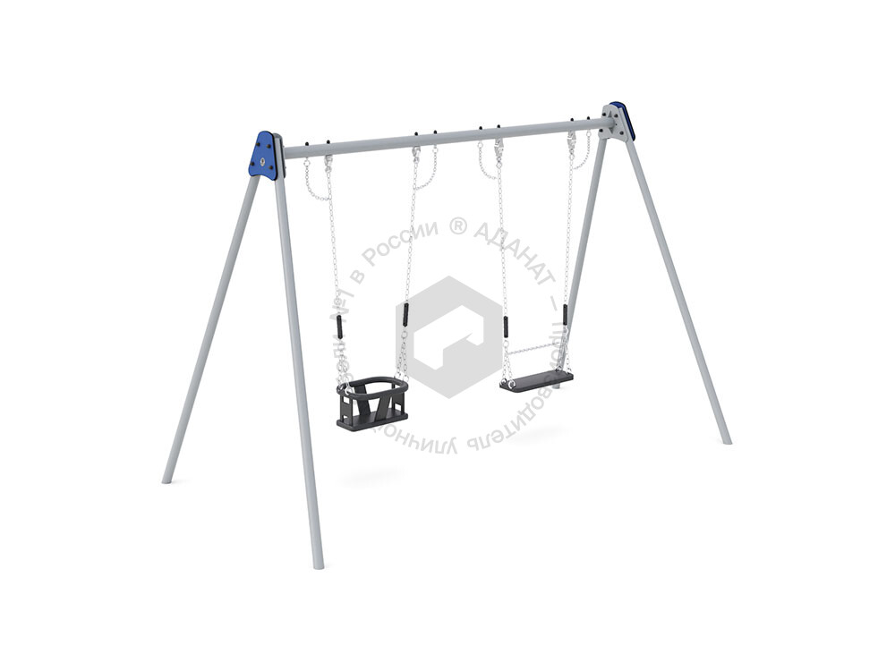 Двухместные качели для разных возрастов, крепящиеся к одному стальному основанию. Подходят для совместного катания малышей на качелях с ограничителями, а для детей более старшего возраста - качели без спинки для свободных движений.