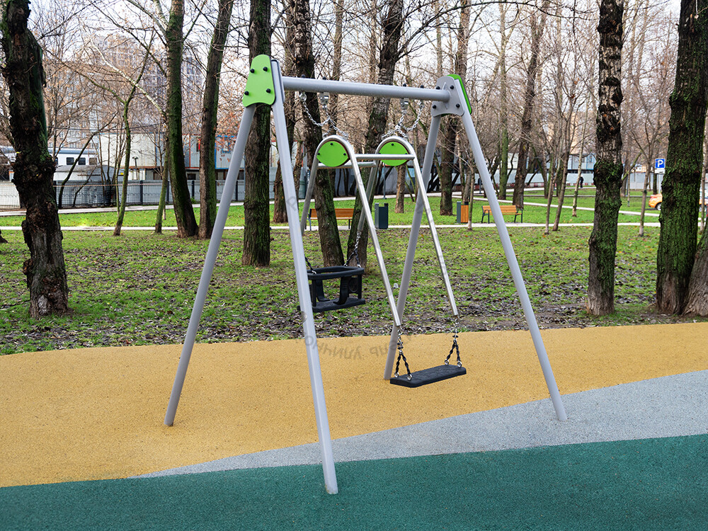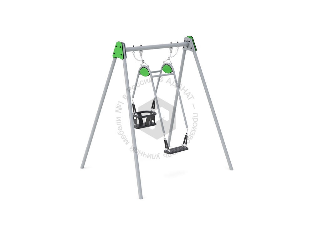 Совмещённая конструкция, состоящая из люльки и качелей без спинки, предназначена для детей разных возрастных категорий.