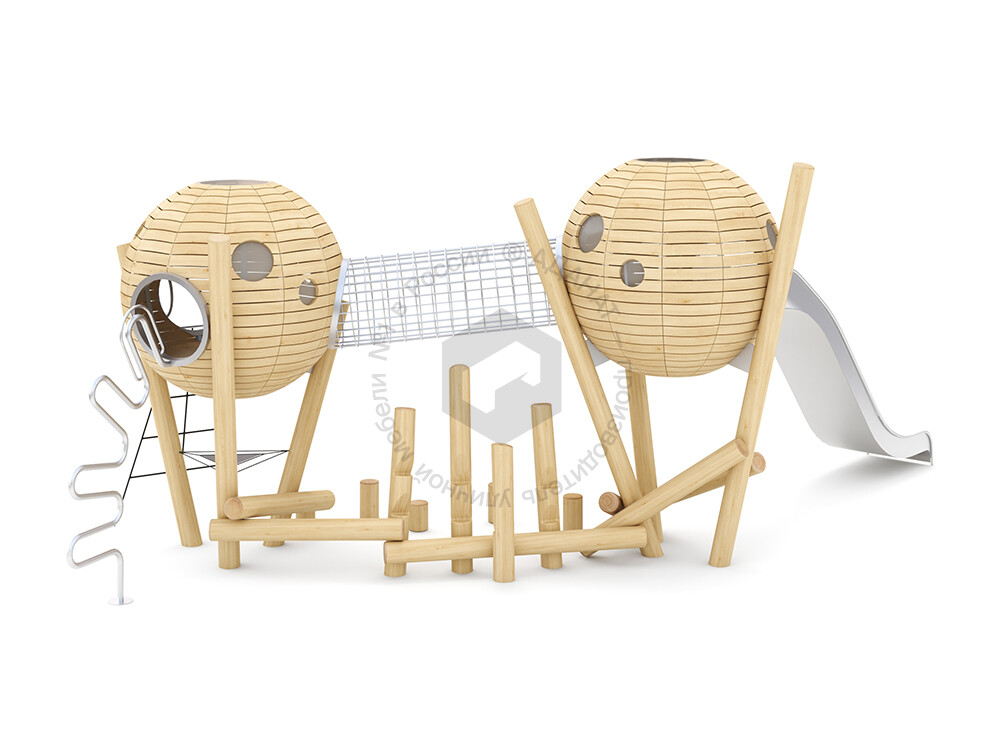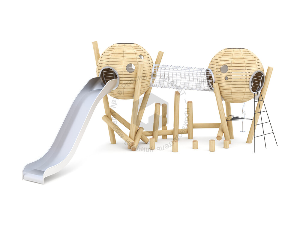 Игровой комплекс представляет собой два домика с окошками из прозрачного поликарбоната, соединённых между собой сетчатым переходом из нержавеющей стали. Один из домиков оборудован лестницей для безопасного подъёма, а второй - металлической горкой для весёлого спуска. Эта комбинация элементов позволяет детям легко подниматься на игровую площадку, расположенную под куполом сферы, переходить по безопасному переходу во вторую сферу и моментально съезжать вниз, обеспечивая цикл непрерывной активной игры, которая способствует развитию координации и ловкости.
