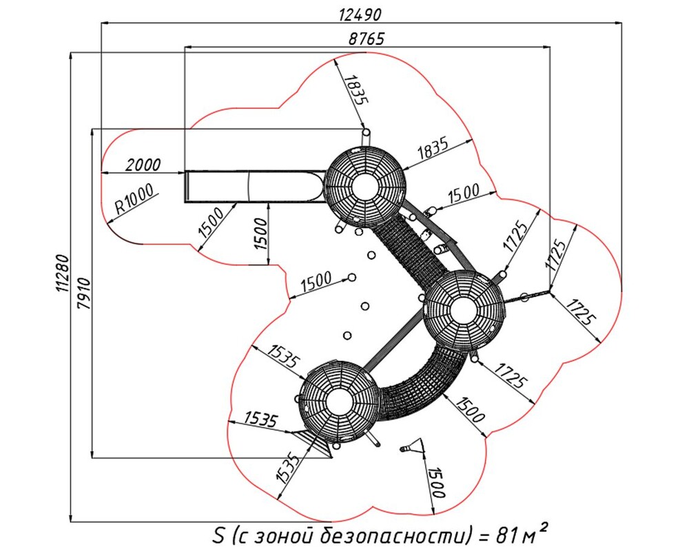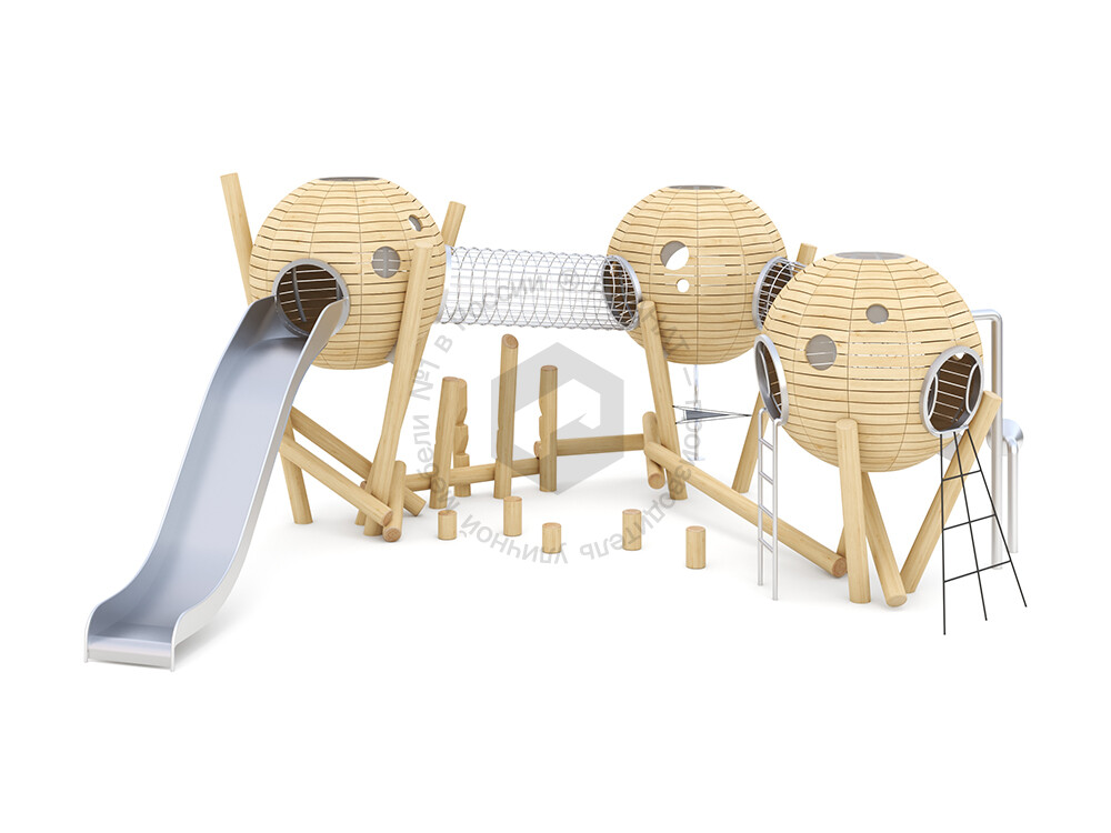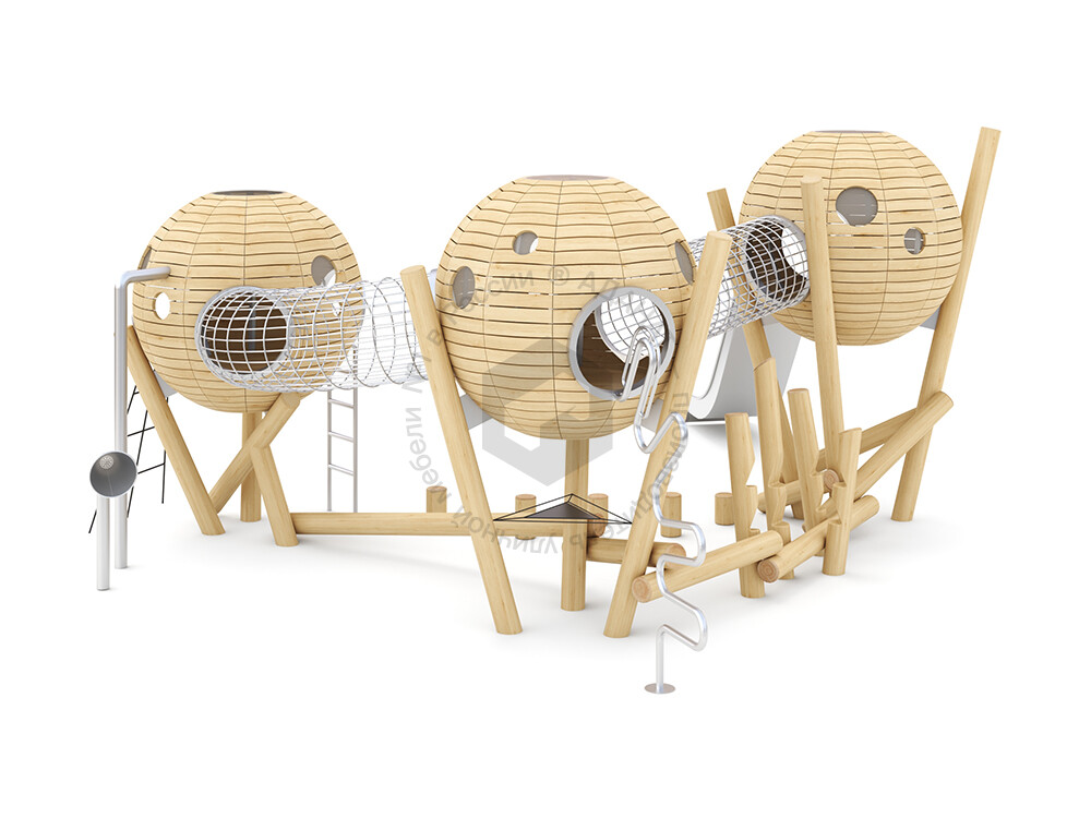 Игровой комплекс представляет собой три домика с окошками из прозрачного поликарбоната, соединённых между собой сетчатыми переходами из нержавеющей стали. Первый домик оборудован лестницей для безопасного подъёма, а третий - металлической горкой для весёлого спуска. Эта комбинация элементов позволяет детям легко подниматься на игровую площадку, расположенную под куполом сферы, переходить по безопасному переходу во вторую и третью сферы и съезжать вниз, обеспечивая цикл непрерывной активной игры, которая способствует развитию координации и ловкости.