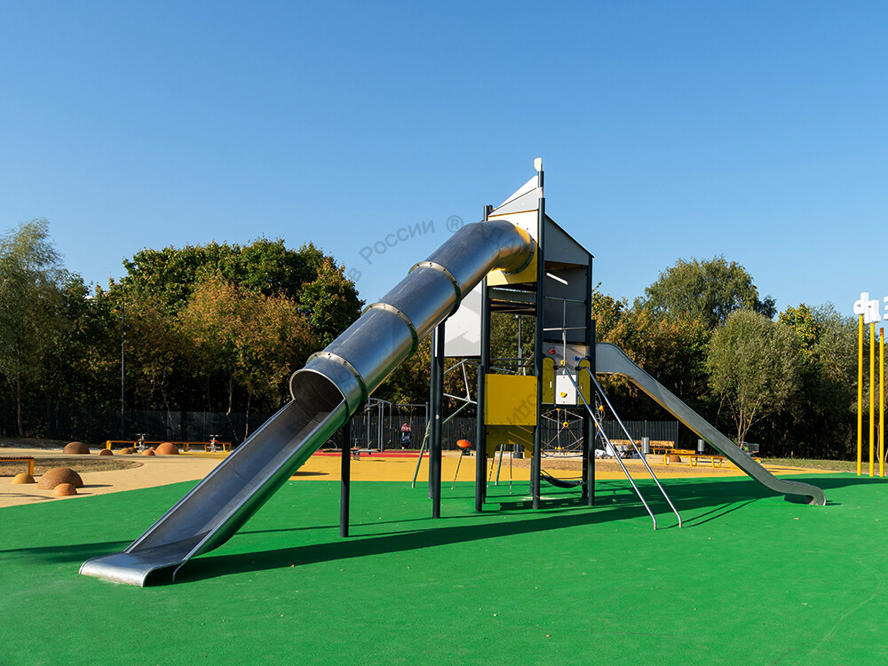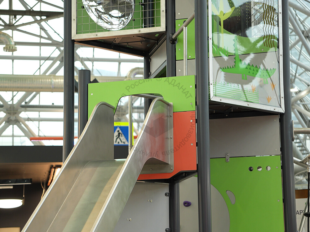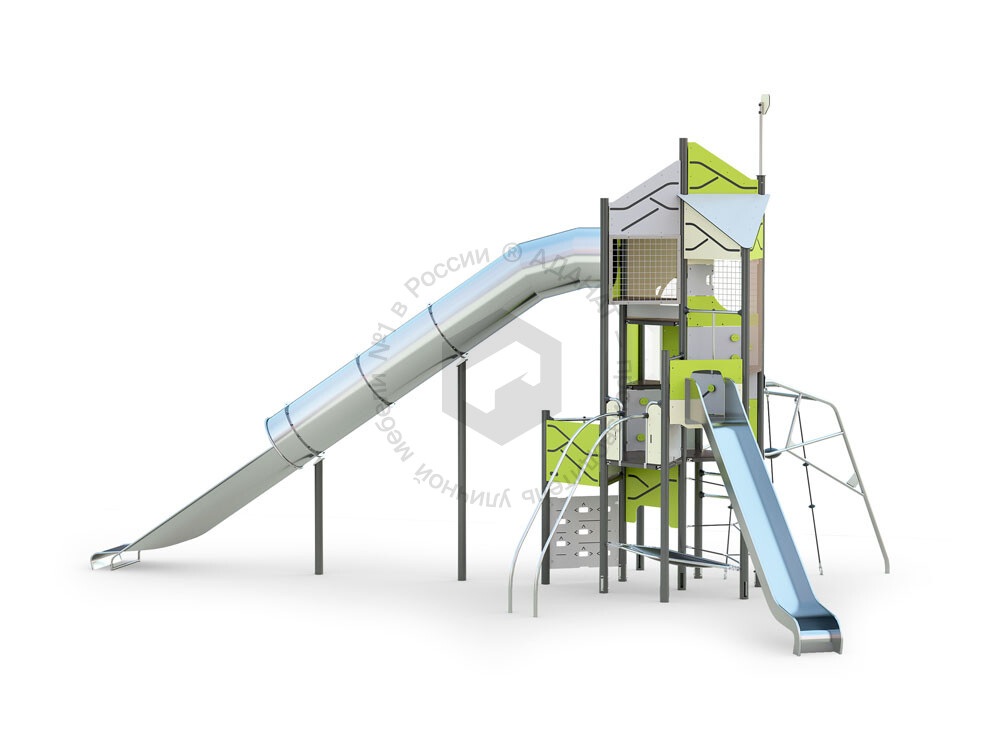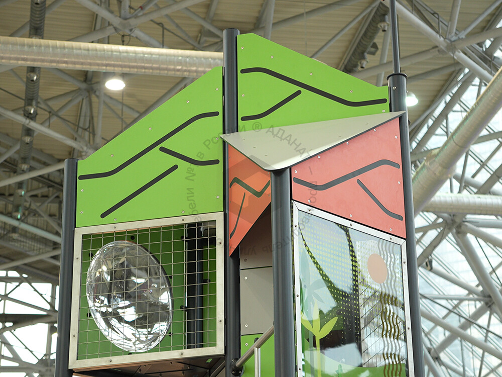 Функциональная игровая башня «Калейдоскоп» - целый лабиринт развлечений для детей. Конструкция состоит из нескольких этажей, на каждый из которых можно подняться при помощи многообразных спортивных элементов: рукоход, различные поручни, лесенки. Главной достопримечательностью площадки является горка-труба. Помимо огромных ощущений от скольжения, дети тренируют чувство пространства и баланса. Набраться смелости и спуститься по крутому тоннелю добавляет приятное ощущение достижения. Язык у горки очень длинный, что придает чувство безопасности в конце спуска. Яркая цветовая гамма обязательно привлечет внимание каждого ребенка.