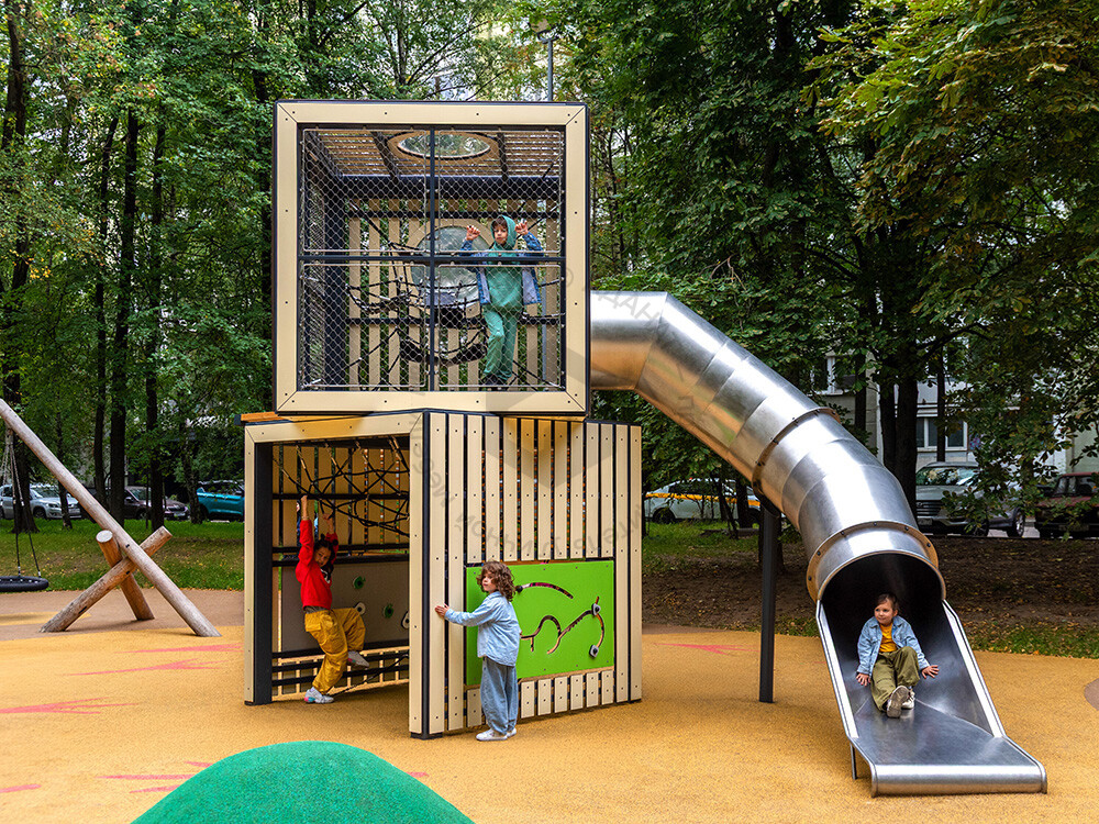 Детская игровая башня для лазания «Куб» - отличный тренажер для развития ловкости, координации, мышечной силы, а также пространственной осведомленности. Яркий дизайн в совокупности со спортивными элементами для лазания: различные паутины, сетчатая труба, перекладины, изогнутая горка-труба, а также элементы логических игр.