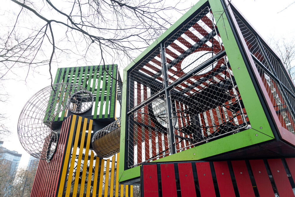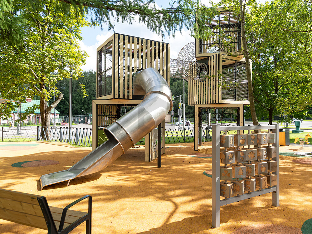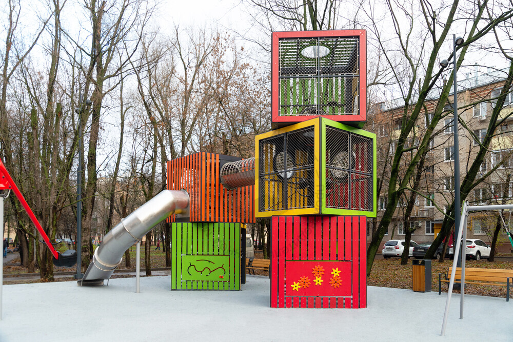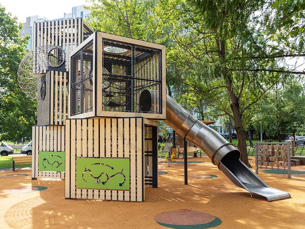 Детская игровая башня для лазания «Куб» - отличный тренажер для развития ловкости, координации, мышечной силы, а также пространственной осведомленности. Яркий дизайн в совокупности со спортивными элементами для лазания: различные паутины, сетчатая труба, перекладины, изогнутая горка-труба, а также элементы логических игр.