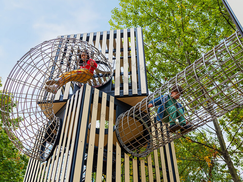 Игровая башня «Куб-5» ЭКО - это отличный тренажер для развития ловкости, координации, мышечной силы, а также пространственной осведомленности. Изделие оснащено прямой и поворотной горкой, сетчатой трубой между 2 и 3 этажами.