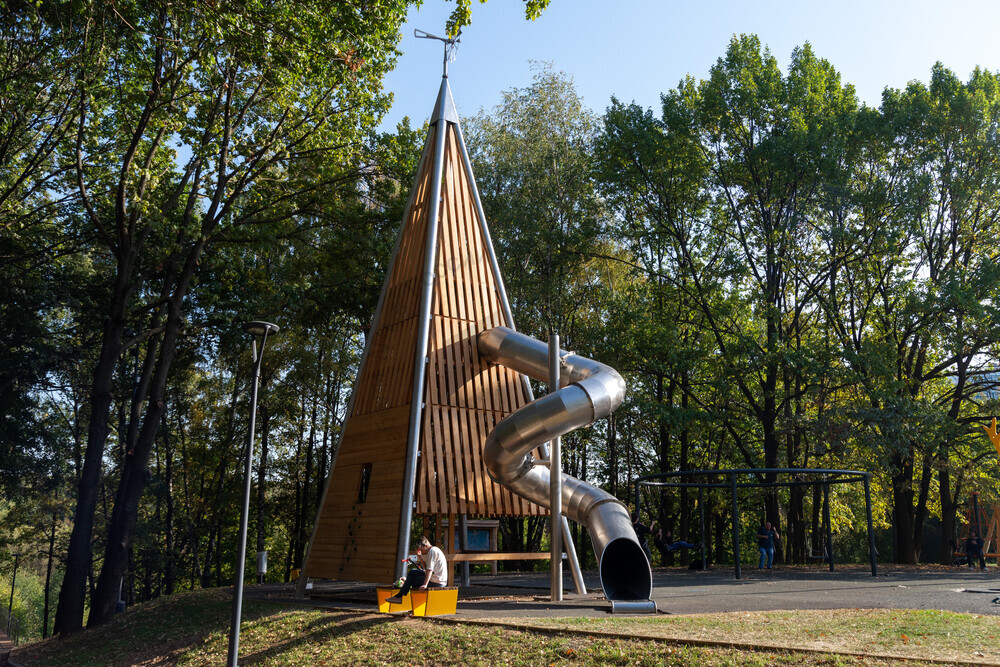 Башня в форме четырёхгранной пирамиды будет интересно смотреться на любой детской площадке. Оборудована лестницей для подъёма на стартовую площадку, а также металлической трубой для спуска.
