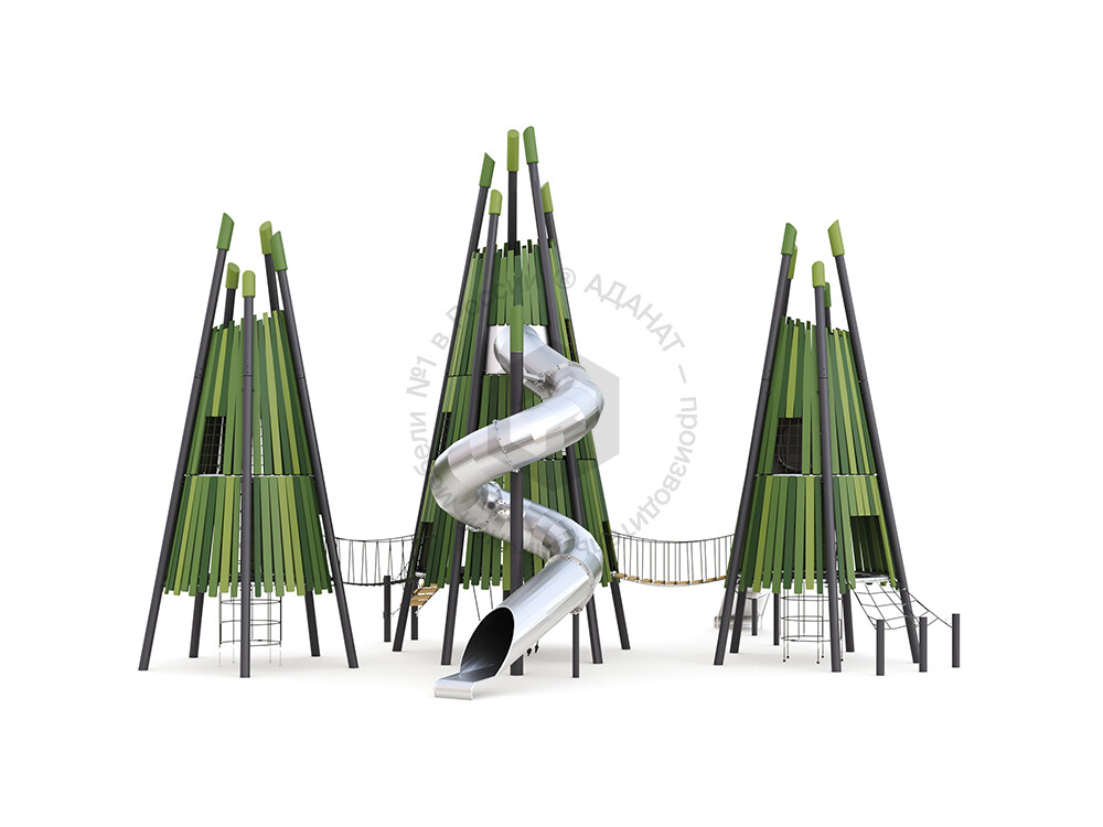 Игровой комплекс «Елки» Тип 3 спроектирован как многофункциональная среда для физического и социального развития. Конструкция объединяет три игровые башни, две из которых оснащены скатами-горками для спуска. Нестандартная форма стимулирует познавательный интерес и желание исследовать пространство. Преодоление подъемов по сетчатым и канатным элементам эффективно развивает вестибулярный аппарат, координацию и мышечную силу. Наличие разных уровней сложности учит детей расчету риска и планированию действий. Спуск с горок закрепляет навыки пространственной ориентации и добавляет игре динамики. В процессе игры в комплексе естественным образом формируются коммуникативные навыки: дети учатся соблюдать очередность и договариваться, что обеспечивает продолжительную и самостоятельную игру.
