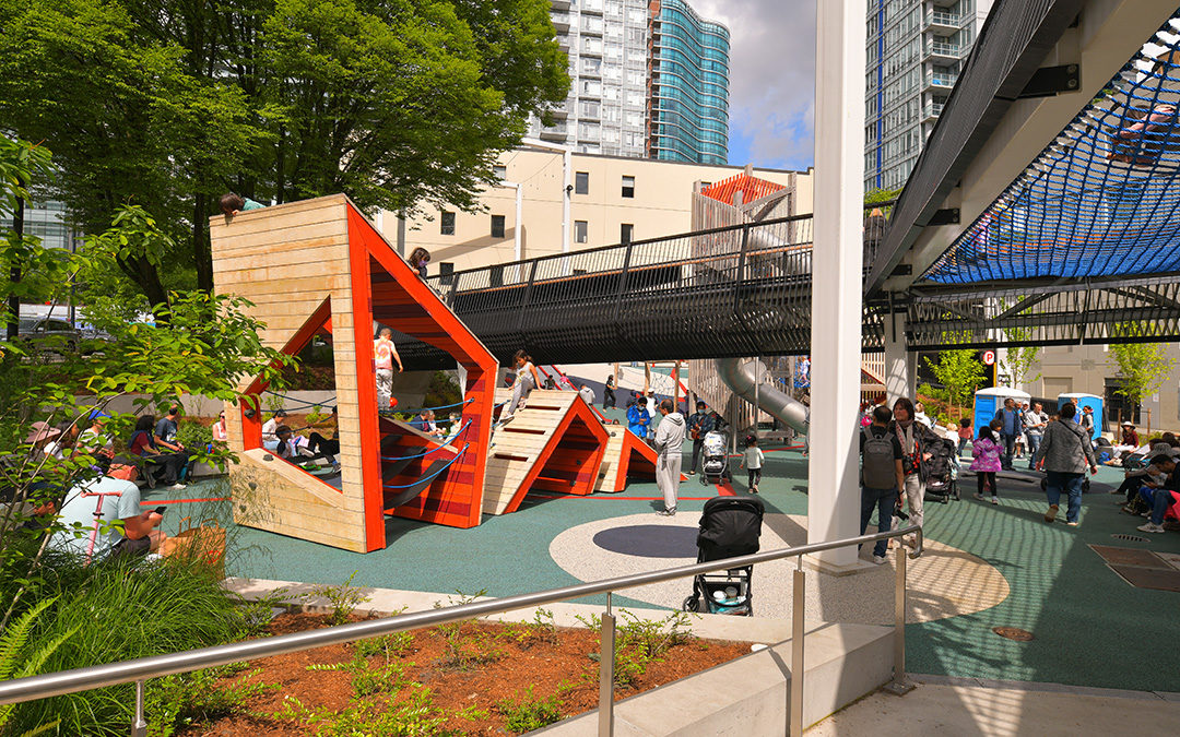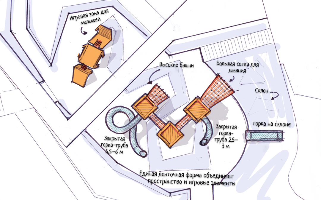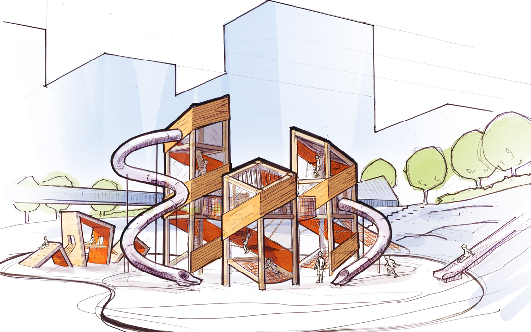 Элементы парка с характерным зигзагообразным рисунком стали вдохновением для дизайна игровой площадки «Сити». Три башни словно обёрнуты лентой, которая соединяет их визуально и функционально, создавая цельное и динамичное игровое пространство. В башни можно войти и выйти через несколько точек, включая два извилистых спуска, а прореженная облицовка обеспечивает обзор во всех направлениях и позволяет взрослым легко следить за детьми.