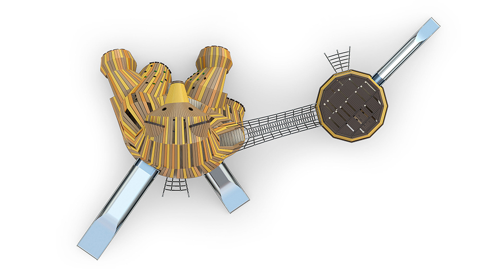 Фигура папы медведя - это целый игровой объект: по ней можно карабкаться снаружи или залезать внутрь. Внутреннее пространство оборудовано гибкими канатами и сетчатыми переходами, а удобная скамья-платформа обеспечивает доступность для всех детей, включая ребят с ограниченными возможностями.