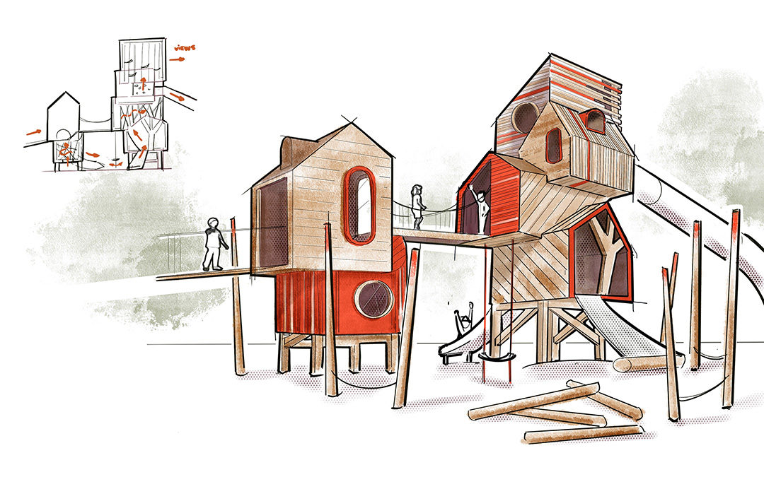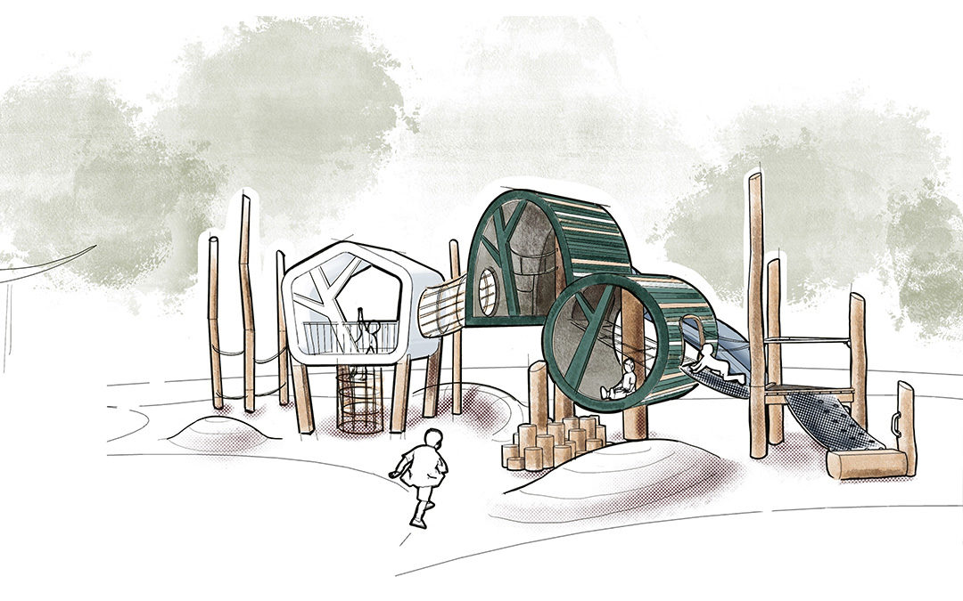 Зона для младших детей (2–5 лет) вдохновлена образами лесных домиков и крон деревьев. Три «капсулы» на опорах имеют лаконичную, современную форму, перекликающуюся с изогнутыми линиями башен старшей зоны. Здесь всё продумано для свободного и безопасного движения: малыши могут выбирать разные маршруты — через тоннель-бочку, домик на дереве или тропу в кроне. А забавный «хомячий тоннель» соединяет лесной навес и домик на дереве, превращая переход из одной зоны в другую в настоящее приключение.
