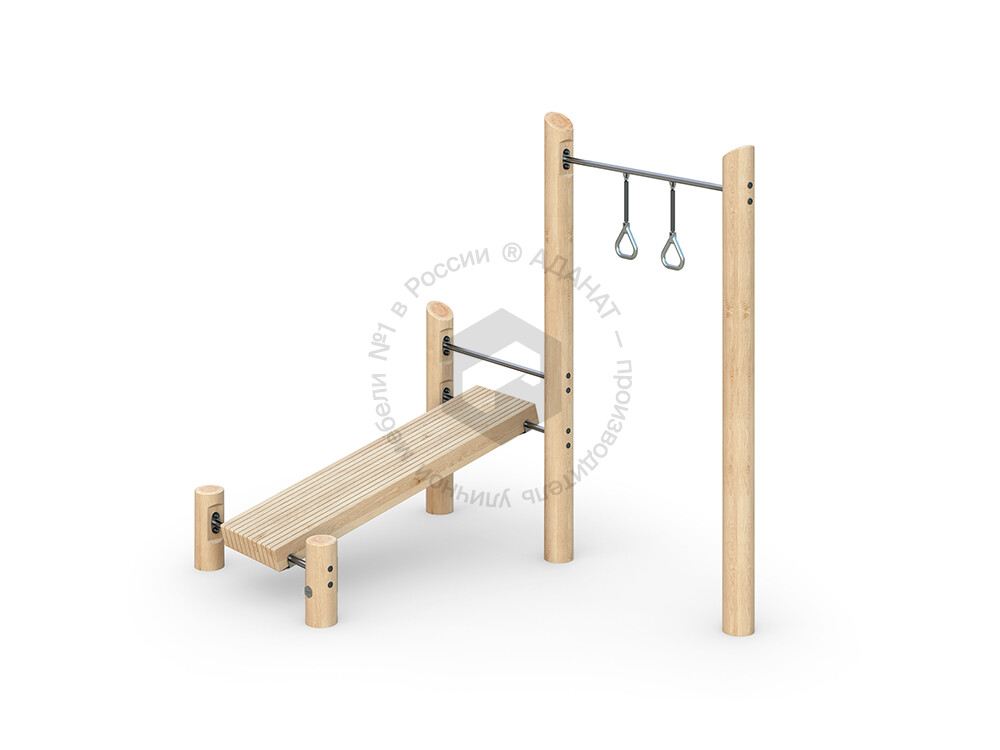 Изделие совмещает наклонную скамью для пресса и подвесные кольца. Компактность позволяет эффективно использовать пространство. Несущая конструкция изготовлена из бревна. Оборудование рассчитано на интенсивное использование без сложного ухода.