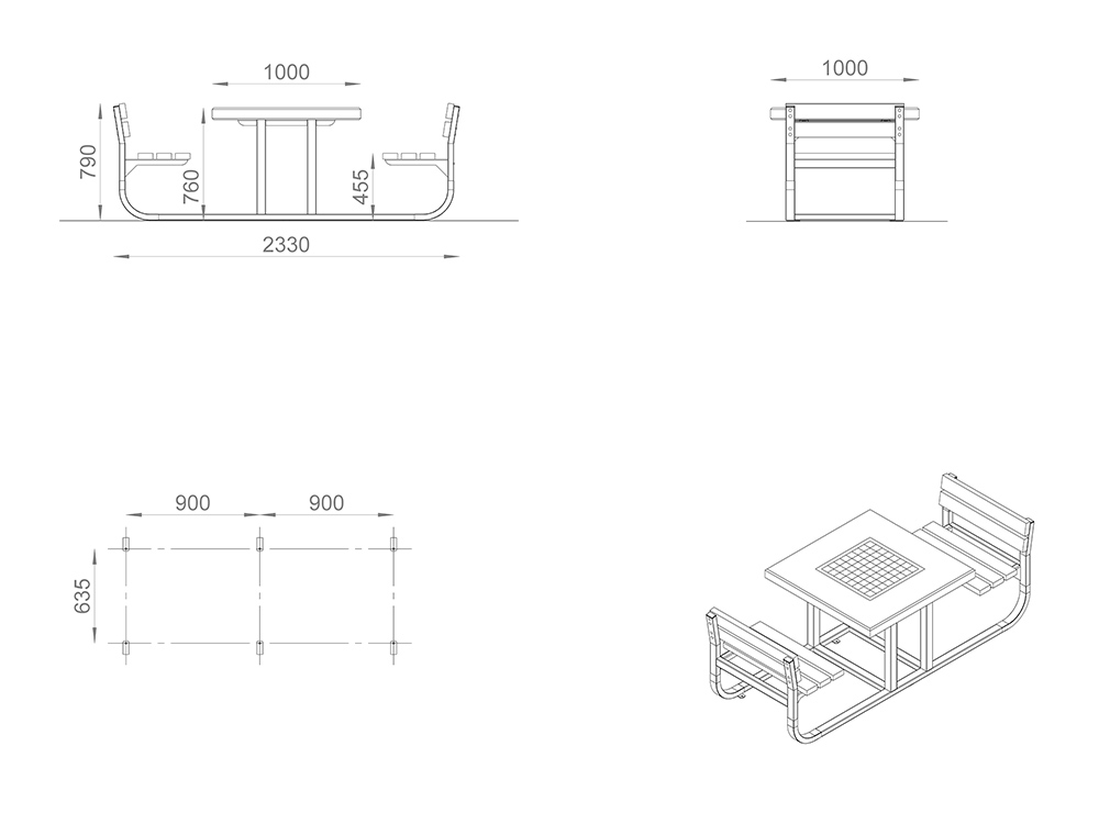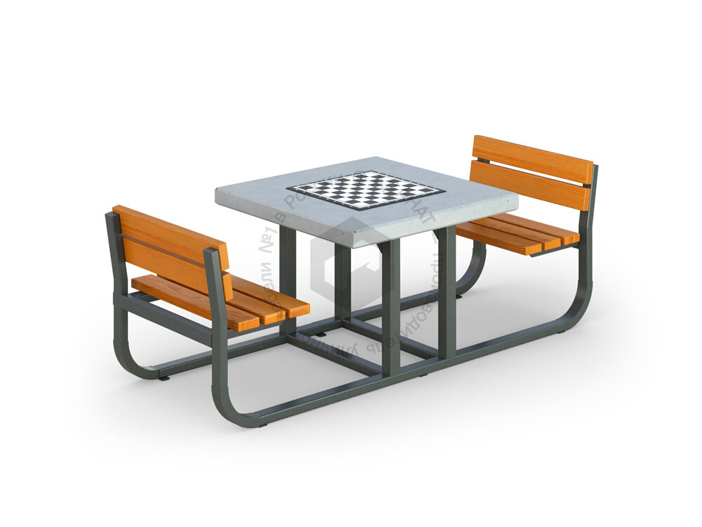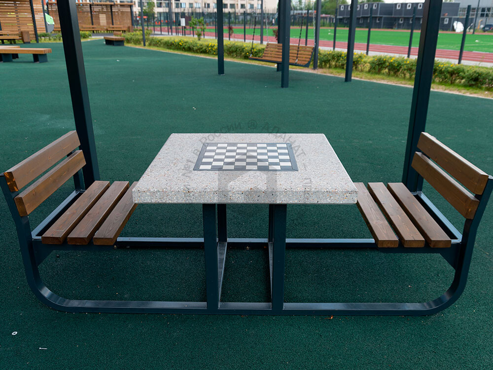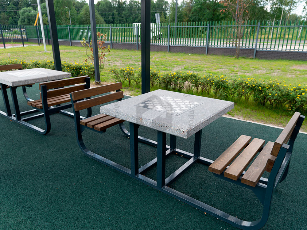 Уличный шахматный стол с сиденьями подойдет для благоустройства парка или городского сквера, школьной или придомовой территории. Такой стол не только красивый декоративный элемент ландшафтного дизайна, но еще и функциональный. Столешница изготовлена из бетона в отделке «Шлифованный на гравии на сером бетоне», устойчивого к внешнему воздействию. Шахматная доска входит в комплект.