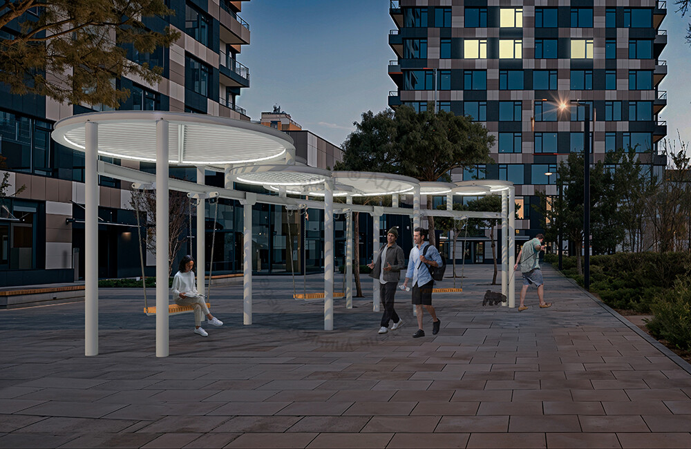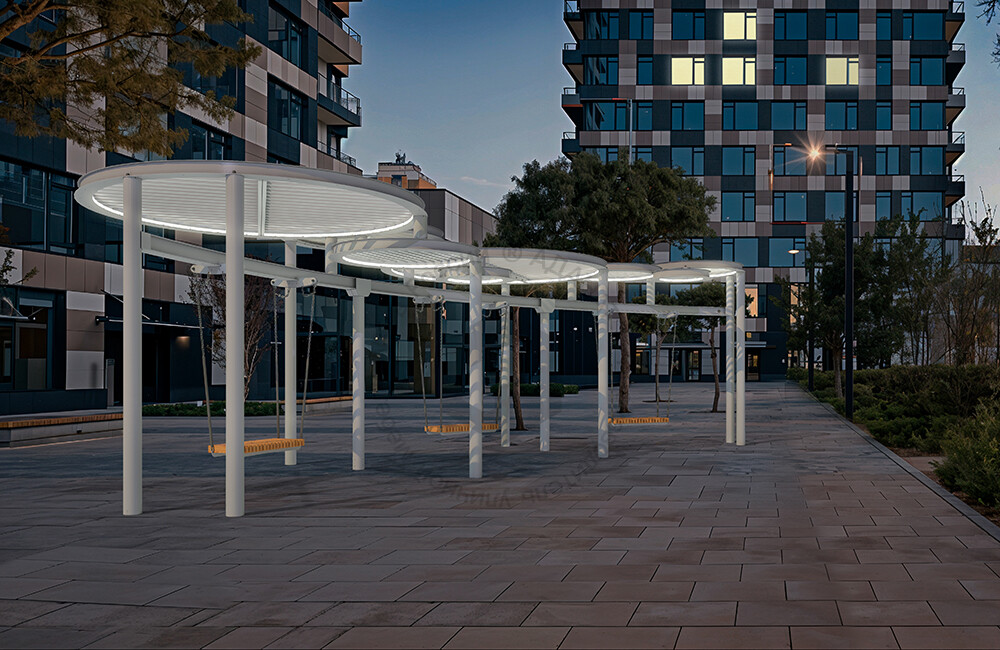 Стильные качели с прочным металлическим навесом, который защищает от солнца. Металлическая конструкция гарантирует долговечность и устойчивость, делая эту модель отличным выбором для обустройства парков, скверов и жилых дворов.
