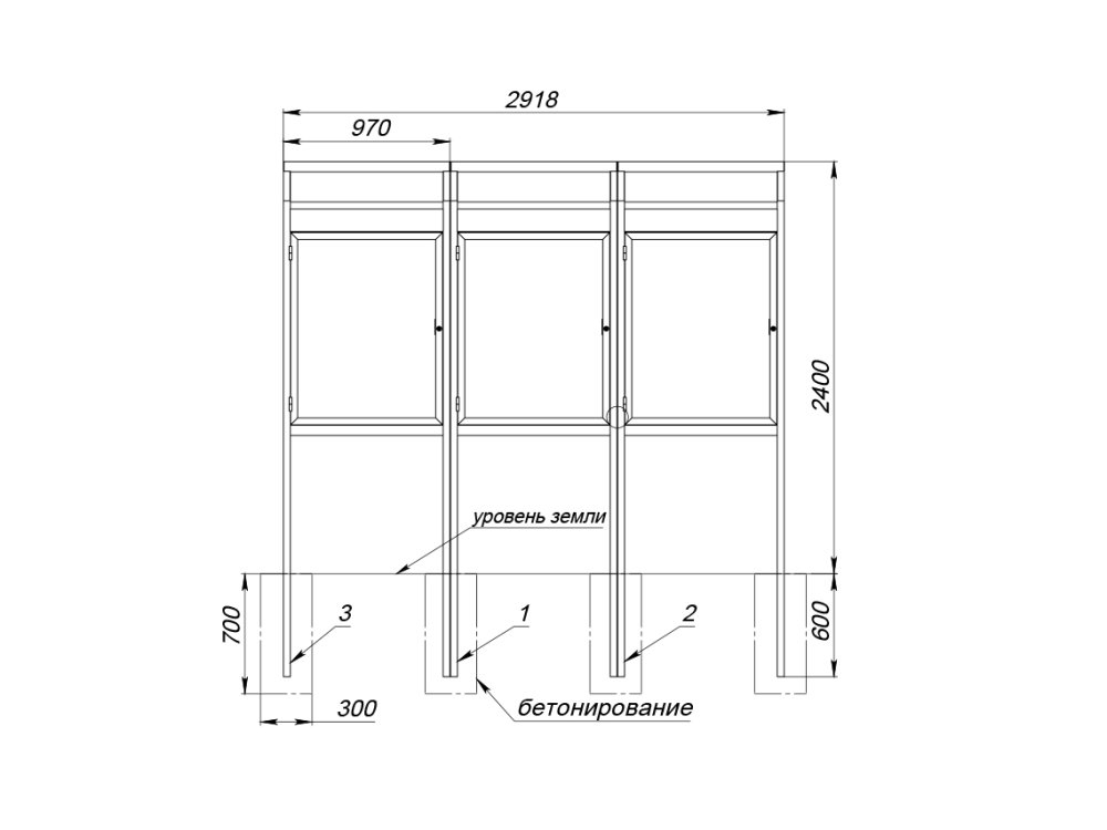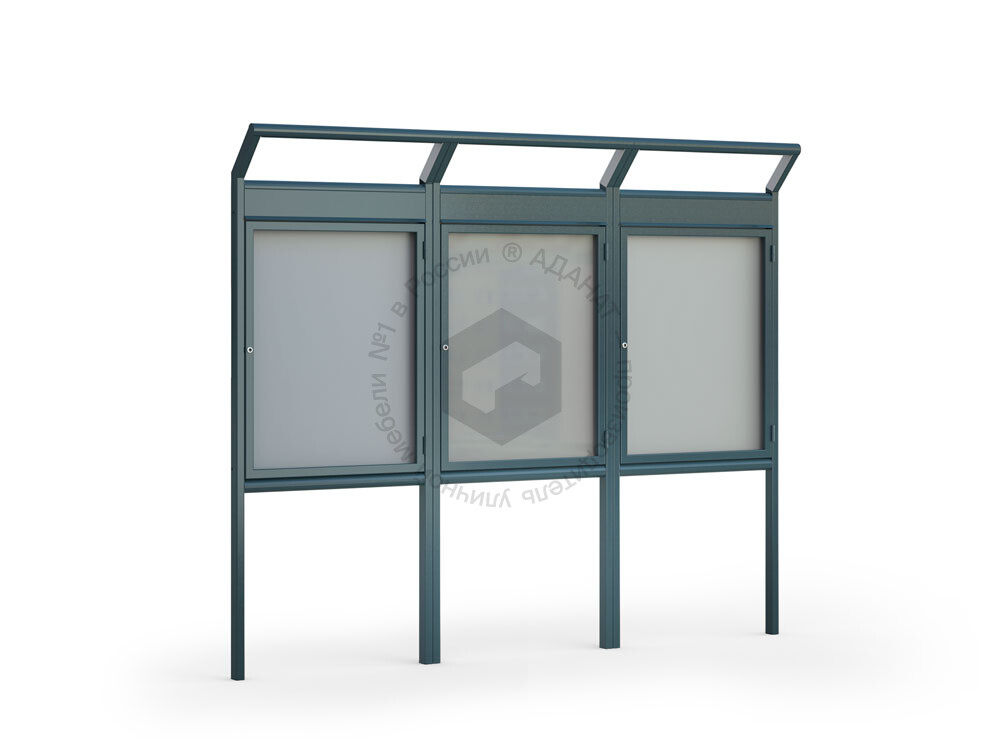Информационный стенд предназначен для установки на прилегающей к административным, офисным и торговым зданиям территории. Каркас изготовлен из металла с антикоррозийным покрытием. Стенд состоит из трёх секций, сгруппированных в единую конструкцию.