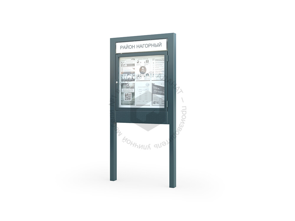 Информационный стенд из металла с дверцей, оснащенный петлями и встроенным замком. Внутри находится 6 карманов для листов формата А4. Нанесение информации не включено в стоимость базового изделия. Дополнительно имеется возможность для брендирования: нанесение лазерной резки, а также добавление вставки из нержавеющей стали.