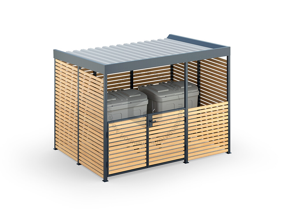 Практичная и аккуратная площадка для сбора ТКО, рассчитанная на установку двух баков и предназначенная для объектов с небольшим и средним объемом образования отходов. Удобный доступ к контейнерам обеспечивают передние створки, выполненные до половины высоты — они не мешают при складировании отходов, но при этом частично закрывают баки, делая их менее заметными.