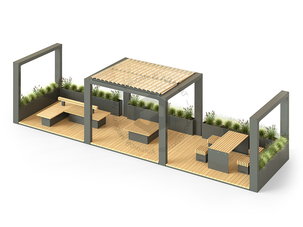 Комфортный парклет для отдыха в модификации для программы «Моя школа». Парклет разделен на несколько зон. Цветочницы прекрасно дополняют городскую среду. Крыша покрыта монолитным поликарбонатом. Стойки парклета выполнены без вставок из поликарбоната.