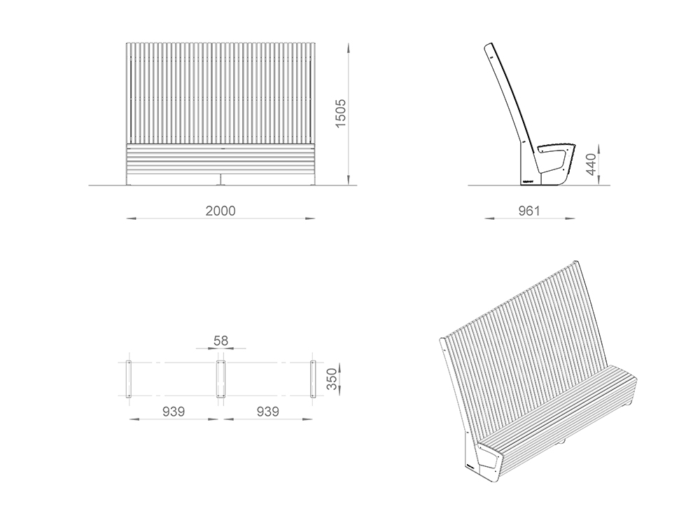 Настил/Спинка: сосна/лиственница. Покрытие: 1 слой пропитки стандартного цвета**, 2 слоя лака.