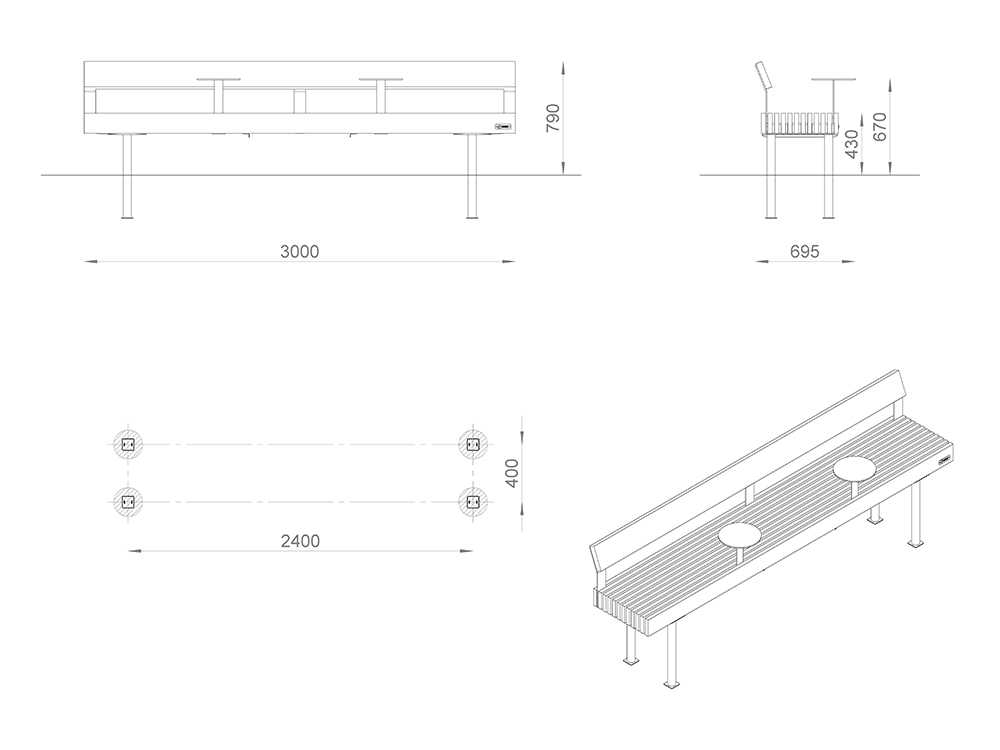 Настил/Спинка: сосна/лиственница. Покрытие: 1 слой пропитки стандартного цвета**, 2 слоя лака.