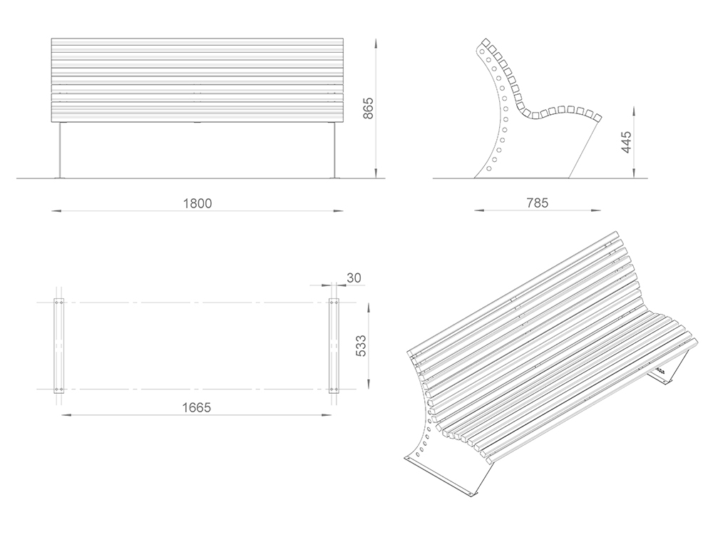 Настил/Спинка: сосна/лиственница. Покрытие: 1 слой пропитки стандартного цвета**, 2 слоя лака.
