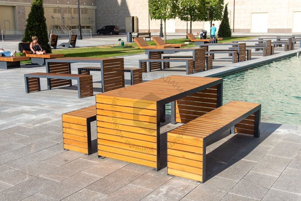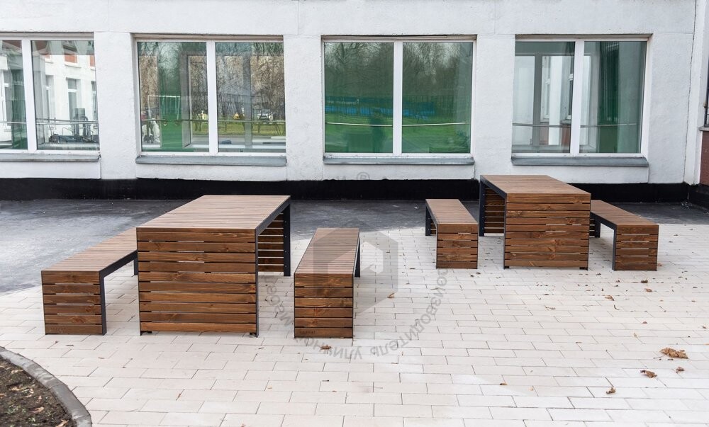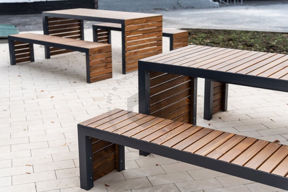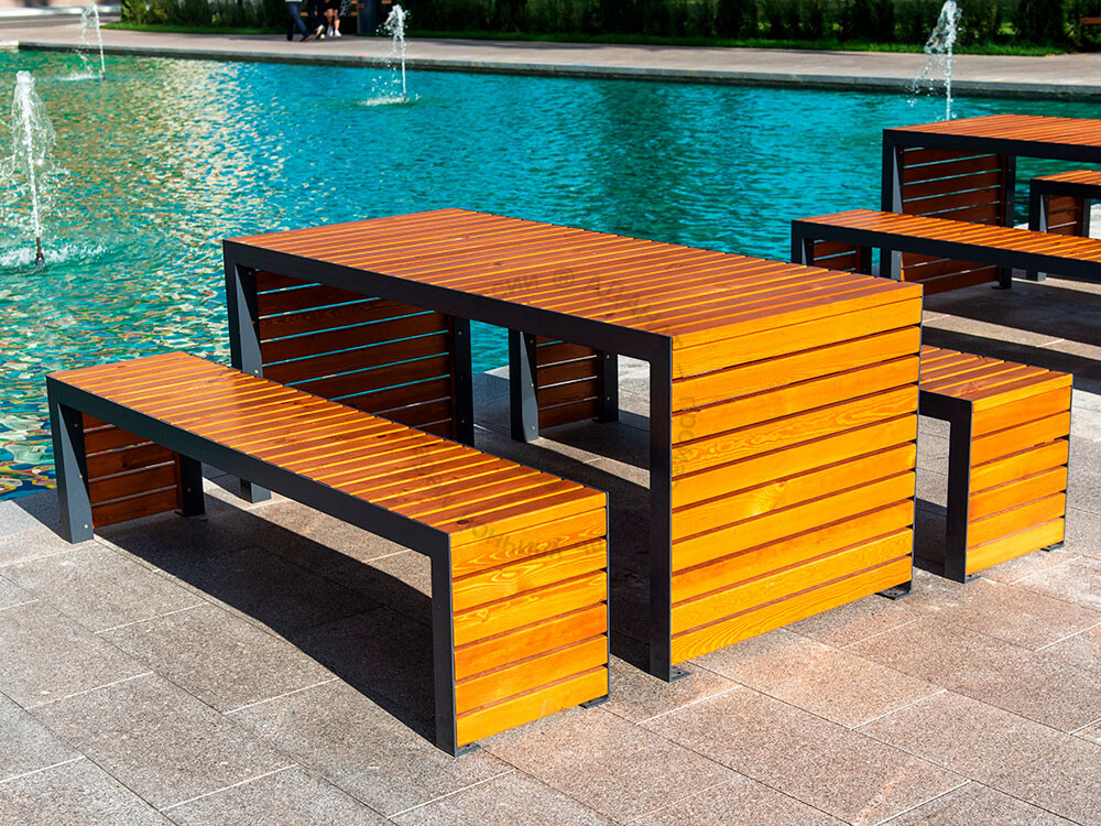 Комплект из стола и двух скамеек отлично подойдет, чтобы оборудовать место для перекуса или настольных игр на любом общественном пространстве.