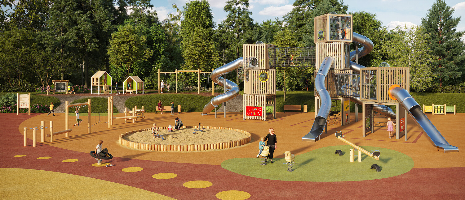 Вокруг них разворачиваются разноплановые игровые сценарии. Полоса препятствий — тренажёр для развития ловкости, включающий балансирующие элементы и канатные переходы. Для малышей предусмотрены качалки на пружине в форме овечек и карусели. Особое место занимает игровой модуль «Ручеёк», развивающий у детей сенсорику и сюжетное мышление. Зону дополняют интерактивные панели, формирующие интеллектуальный сегмент площадки. Уютная зона отдыха с качелями и домиками-беседками серии «Барни» в стиле барнхаус.